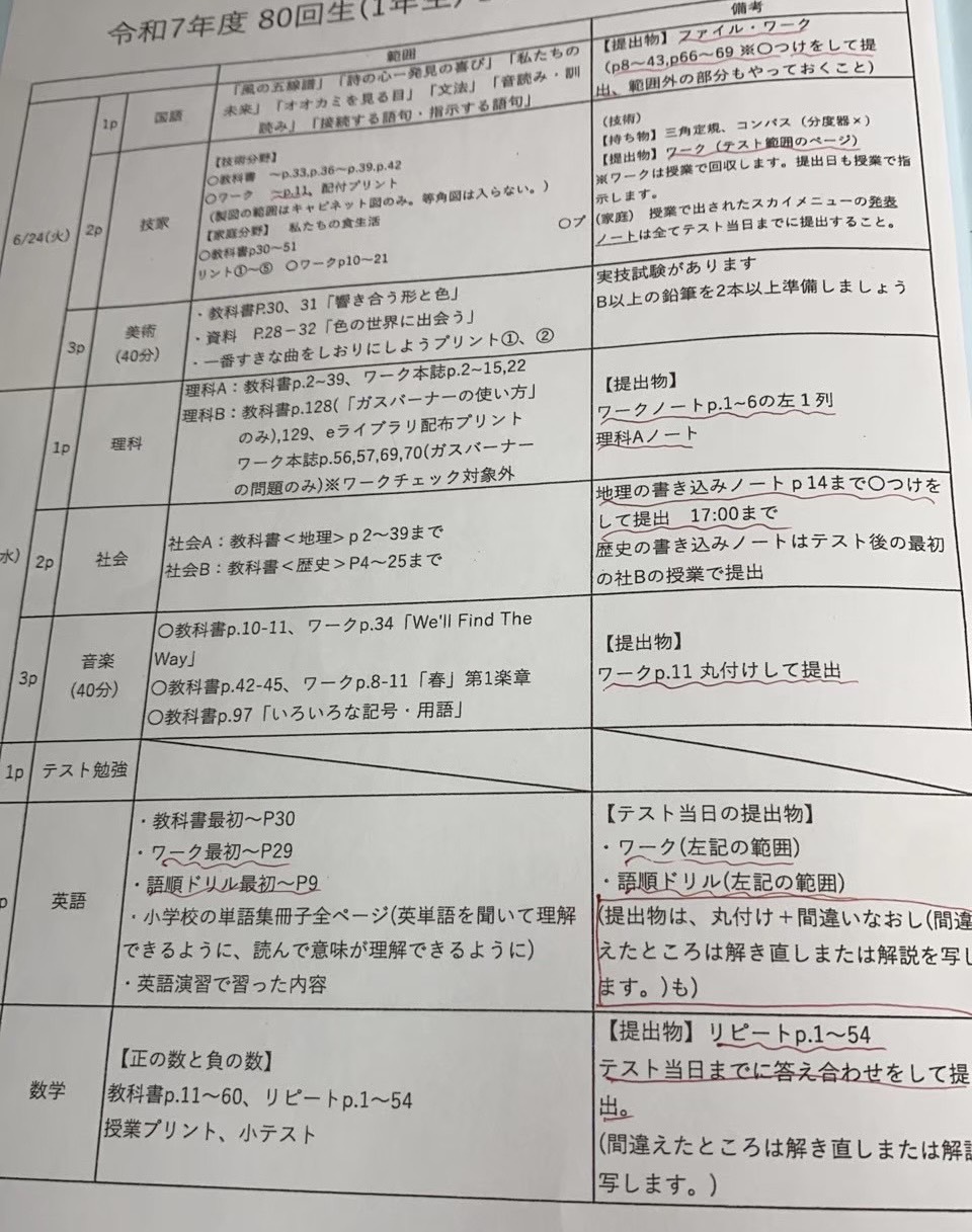 本庄中1年生1学期末テスト範囲