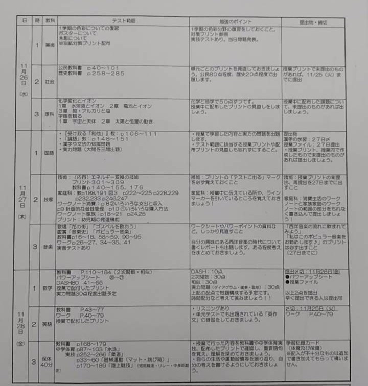 兵庫・神戸 須佐野中学校のテスト範囲